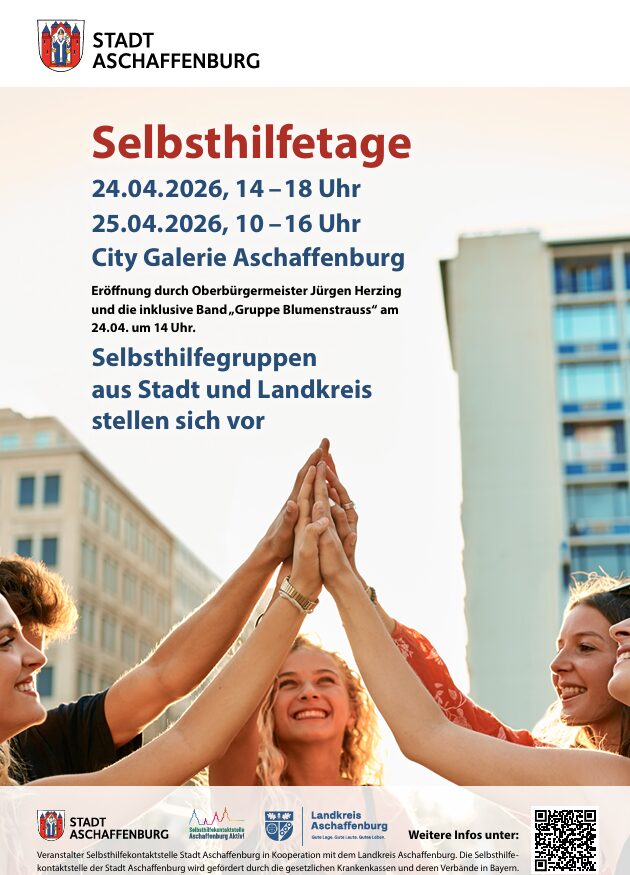 Am 24. und 25. April finden zum 19. Mal die Selbsthilfetage in der City Galerie in Aschaffenburg statt. Insgesamt 27 Selbsthilfegruppen und Beratungsstellen mit Selbsthilfebezug stehen dort Betroffenen, Angehörigen und Interessent*innen rund um die Themen chronische Erkrankung und Behinderung, psychische Erkrankungen und seelische Gesundheit, Lebensbewältigung sowie Sucht zum gegenseitigen Austausch zur Verfügung.